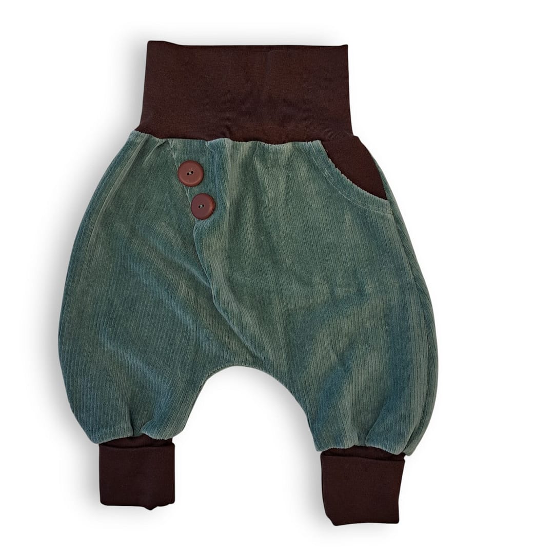 Babyhose aus weichem, grünen Cordstoff mit elastischen schwarzen Bündchen, praktischer Tasche und Knöpfen am Bund – bequem und hautfreundlich für Babys und Kleinkinder.