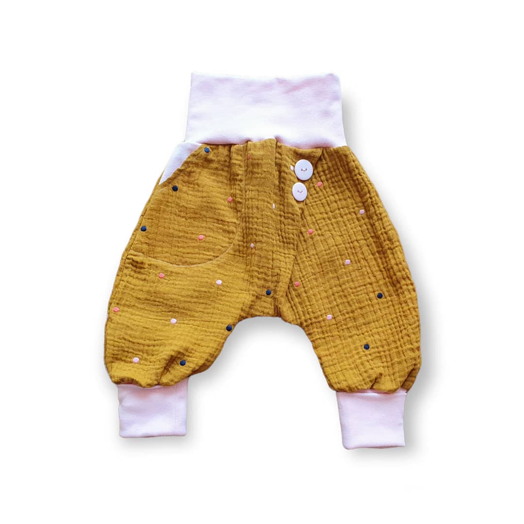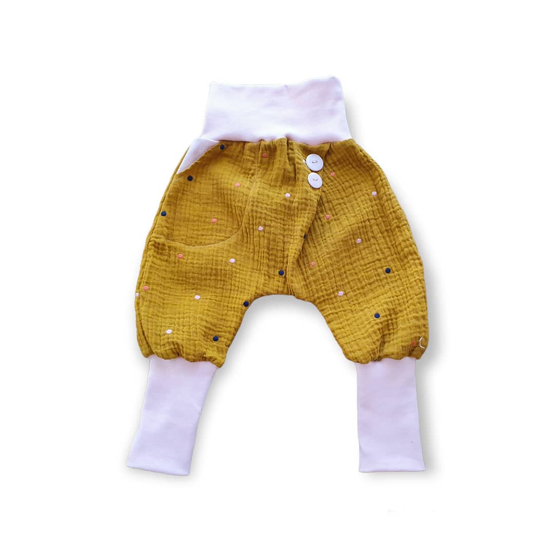 … mitwachsende Hosen und speziell für Tragekinder oder Stoffwindelkinder geeignet. Der Schnitt sitzt locker und kann dank der flexiblen Bündchen an Taille und Knöcheln über mehrere Grössen hinweg getragen werden. Die Beinlänge kann um die Höhe des Beinbündchens verlängert werden, das ist sehr hilfreich für Tragekinder, denen oft Beinlänge an den Hosen fehlt. Die Hosen sind etwas grösser geschnitten als gewöhnlich, sodass die Kleinen hineinwachsen können.