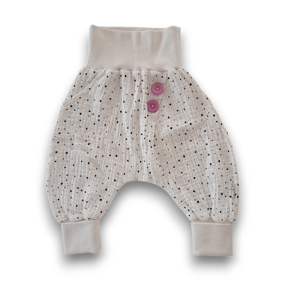 Diese leichte Babypumphose ist aus 100 % Baumwolle Mousseline ist wunderbar geeignet für kühle Sommertage oder zum Schutz der Babyhaut, wenn die Sonne gar arg brennt. Viele Eltern schätzen die wunderbare Eigenschaft des leichten Musselin-Stoffs.